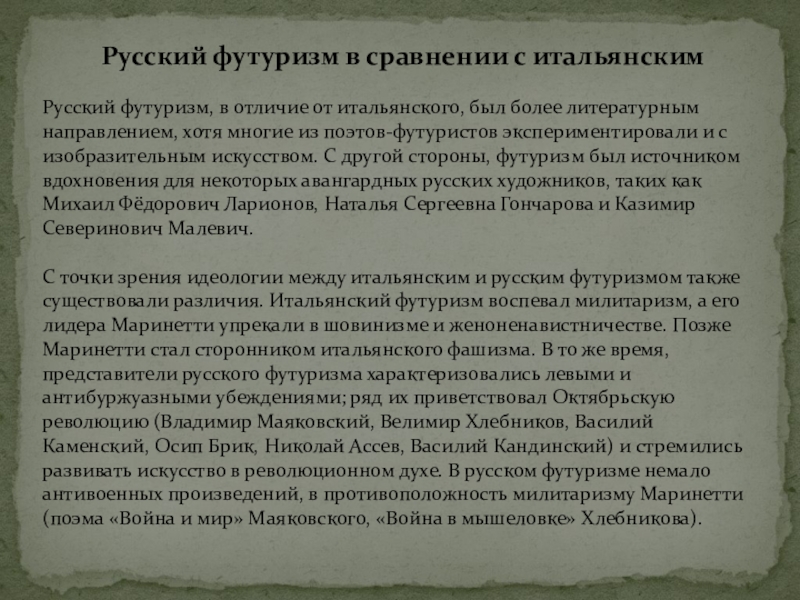 был более литературным направлением, хотя многие из поэтов-футуристов экспериментировали и с изобразительным искусством. С другой стороны, футуризм был источником вдохновения для некоторых авангардных русских художников, таких как Михаил Фёдорович Ларионов, Наталья Сергеевна Гончарова и Казимир Северинович Малевич.