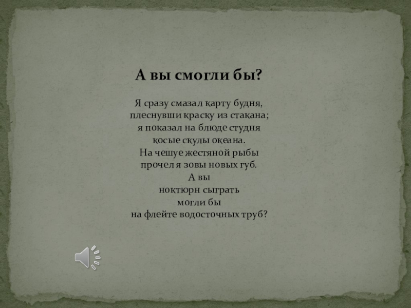 — бунт против привычных норм стихотворной речи, экспериментаторство в области ритмики, рифмы, ориентация на произносимый стих, лозунг, плакат;