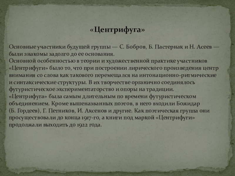 «Центрифуга» была самым длительным по времени футуристическом объединением. Кроме вышеназванных поэтов, в него входили Божидар (Б. Гордеев), Г. Петников, И. Аксенов и другие. Как поэтическая группа они просуществовали до конца 1917-го, а книги под маркой «Центрифуги» продолжали выходить до 1922 года.