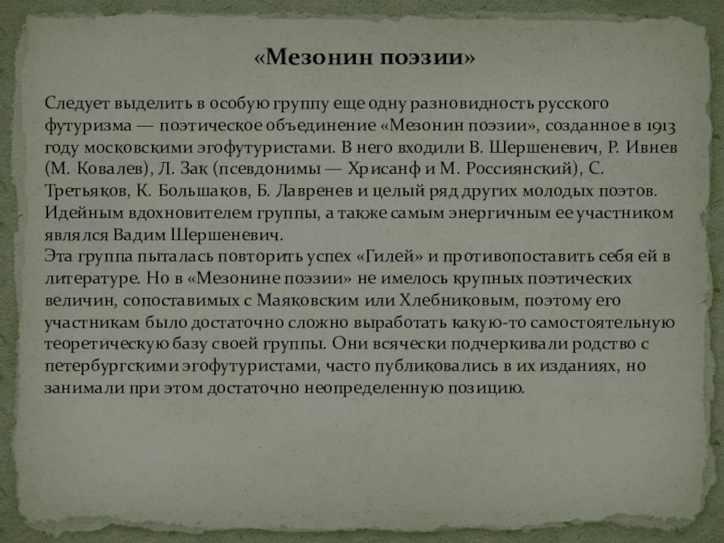 — поэтическое объединение «Мезонин поэзии», созданное в 1913 году московскими эгофутуристами. В него входили В. Шершеневич, Р. Ивнев (М. Ковалев), Л. Зак (псевдонимы — Хрисанф и М. Россиянский), С. Третьяков, К. Большаков, Б. Лавренев и целый ряд других молодых поэтов.