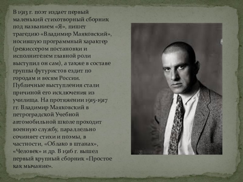 «Я», пишет трагедию «Владимир Маяковский», носившую программный характер (режиссером постановки и исполнителем главной роли выступил он сам), а также в составе группы футуристов ездит по городам и весям России. Публичные выступления стали причиной его исключения из училища. На протяжении 1915-1917 гг. Владимир Маяковский в петроградской Учебной автомобильной школе проходит военную службу, параллельно сочиняет стихи и поэмы, в частности, «Облако в штанах», «Человек» и др. В 1916 г. вышел первый крупный сборник «Простое как мычание».