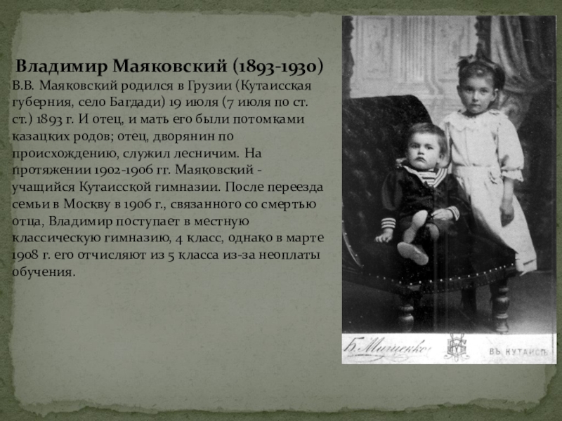 19 июля (7 июля по ст. ст.) 1893 г. И отец, и мать его были потомками казацких родов; отец, дворянин по происхождению, служил лесничим. На протяжении 1902-1906 гг. Маяковский - учащийся Кутаисской гимназии. После переезда семьи в Москву в 1906 г., связанного со смертью отца, Владимир поступает в местную классическую гимназию, 4 класс, однако в марте 1908 г. его отчисляют из 5 класса из-за неоплаты обучения.