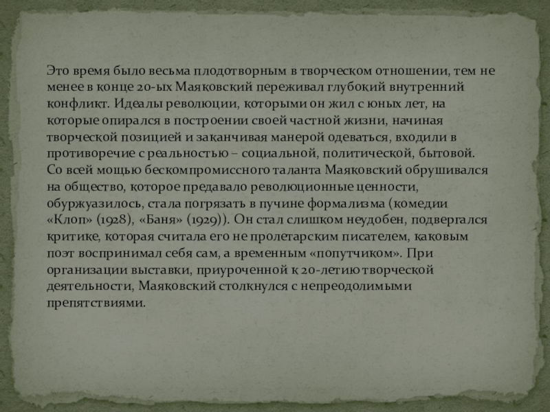 в конце 20-ых Маяковский переживал глубокий внутренний конфликт. Идеалы революции, которыми он жил с юных лет, на которые опирался в построении своей частной жизни, начиная творческой позицией и заканчивая манерой одеваться, входили в противоречие с реальностью – социальной, политической, бытовой. Со всей мощью бескомпромиссного таланта Маяковский обрушивался на общество, которое предавало революционные ценности, обуржуазилось, стала погрязать в пучине формализма (комедии «Клоп» (1928), «Баня» (1929)). Он стал слишком неудобен, подвергался критике, которая считала его не пролетарским писателем, каковым поэт воспринимал себя сам, а временным «попутчиком». При организации выставки, приуроченной к 20-летию творческой деятельности, Маяковский столкнулся с непреодолимыми препятствиями.