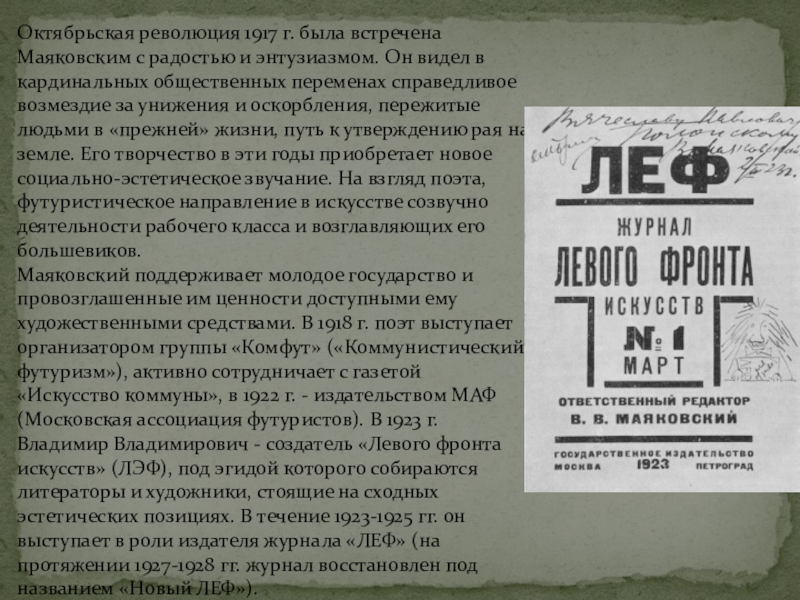 Маяковский поддерживает молодое государство и провозглашенные им ценности доступными ему художественными средствами. В 1918 г. поэт выступает организатором группы «Комфут» («Коммунистический футуризм»), активно сотрудничает с газетой «Искусство коммуны», в 1922 г. - издательством МАФ (Московская ассоциация футуристов). В 1923 г. Владимир Владимирович - создатель «Левого фронта искусств» (ЛЭФ), под эгидой которого собираются литераторы и художники, стоящие на сходных эстетических позициях. В течение 1923-1925 гг. он выступает в роли издателя журнала «ЛЕФ» (на протяжении 1927-1928 гг. журнал восстановлен под названием «Новый ЛЕФ»).