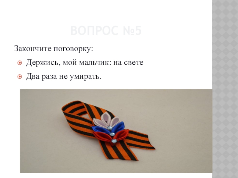 Вопрос №5Закончите поговорку:Держись, мой мальчик: на светеДва раза не умирать.