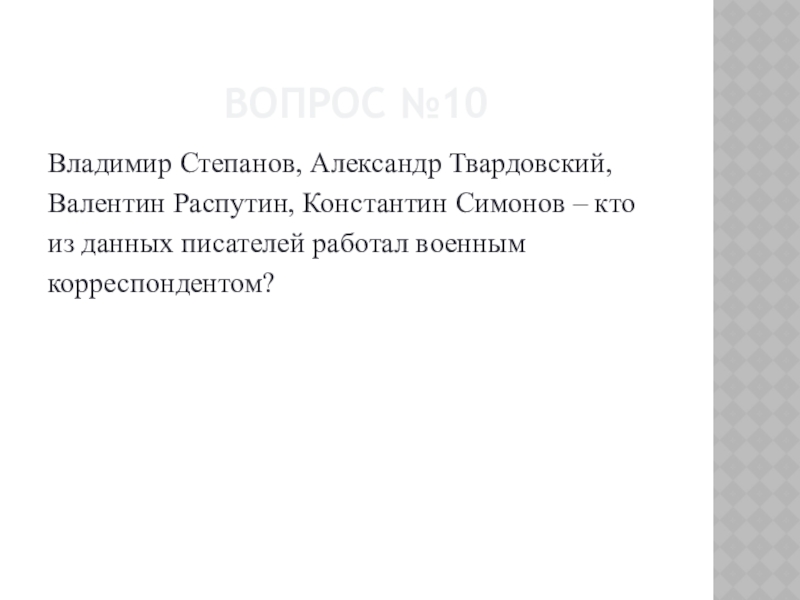 Вопрос №10Владимир Степанов, Александр Твардовский, Валентин Распутин, Константин Симонов – кто из данных писателей работал военным корреспондентом?