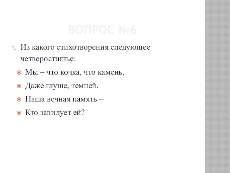 Вопрос №6Из какого стихотворения следующее четверостишье:Мы – что кочка, что камень,Даже глуше, темней.Наша вечная память – Кто
