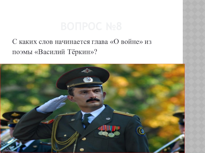 Вопрос №8С каких слов начинается глава «О войне» из поэмы «Василий Тёркин»?