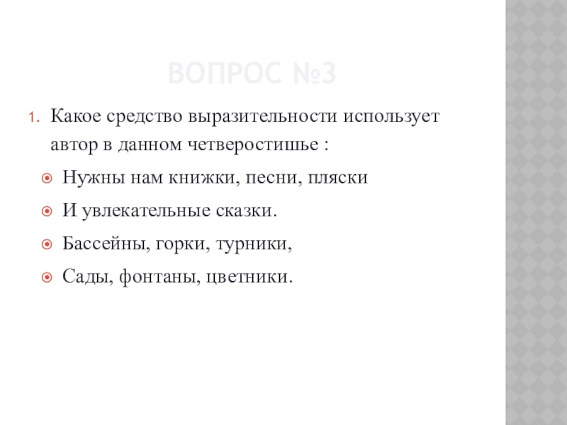 Вопрос №3Какое средство выразительности использует автор в данном четверостишье :Нужны нам книжки, песни, пляскиИ увлекательные сказки.Бассейны, горки,