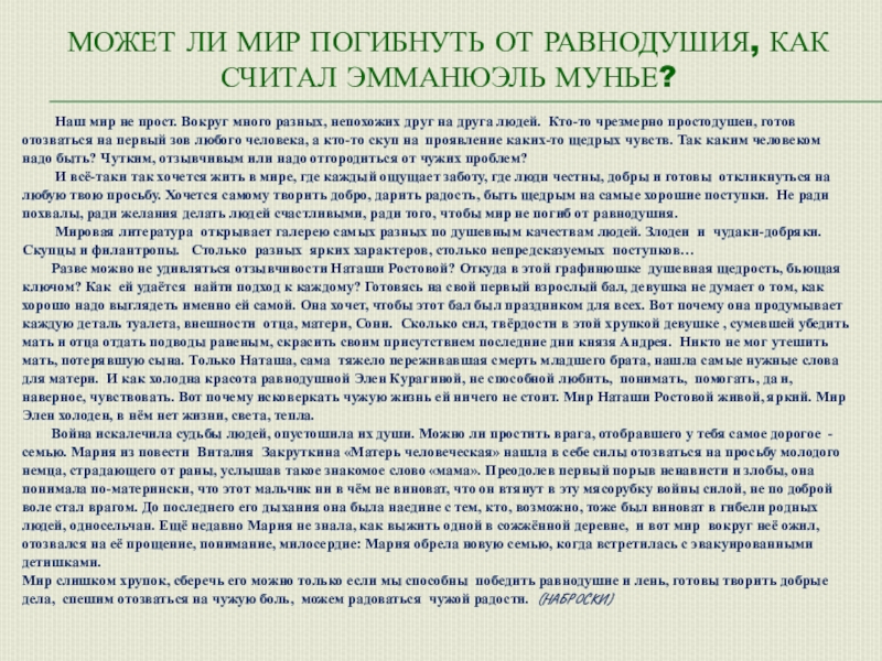 Заботу о Друбецких, Соне берёт на себя семья Ростовых ; по-своему заботливы старый князь Болконский, князь Андрей. Заботу о солдатах проявляет Кутузов, капитан Тушин