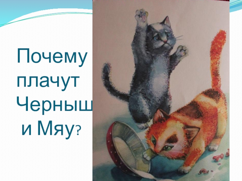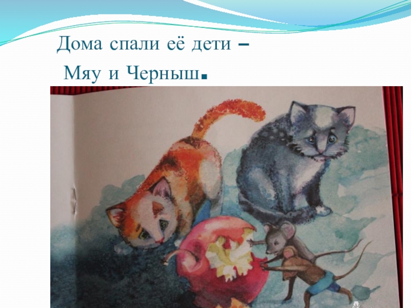 Слайд 5Дома спали её дети – Мяу и Черныш.