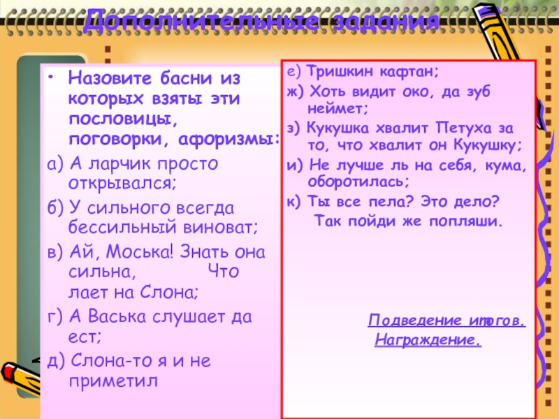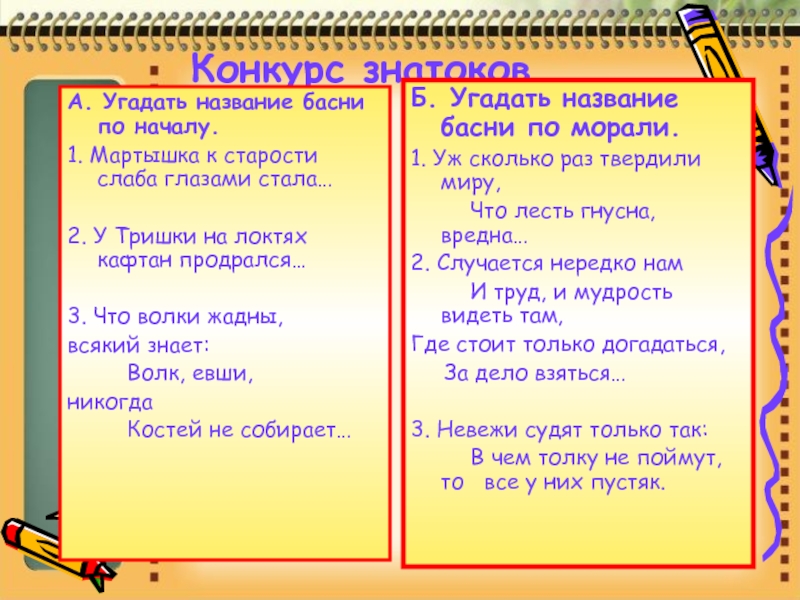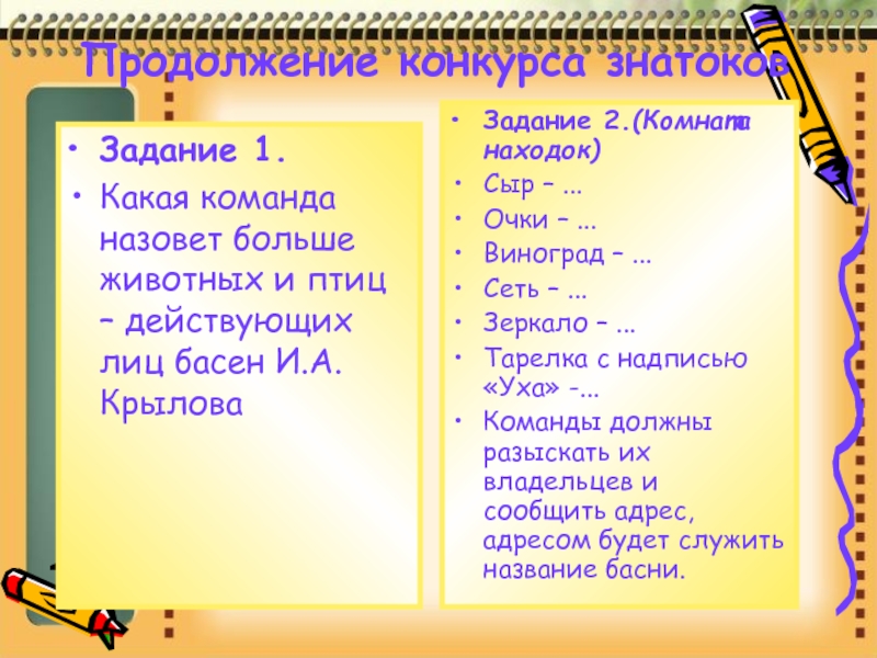 Команды должны разыскать их владельцев и сообщить адрес, адресом будет служить название басни.