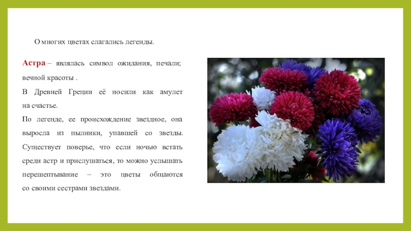 Слайд 7Астра – являлась символ ожидания, печали; вечной красоты .
