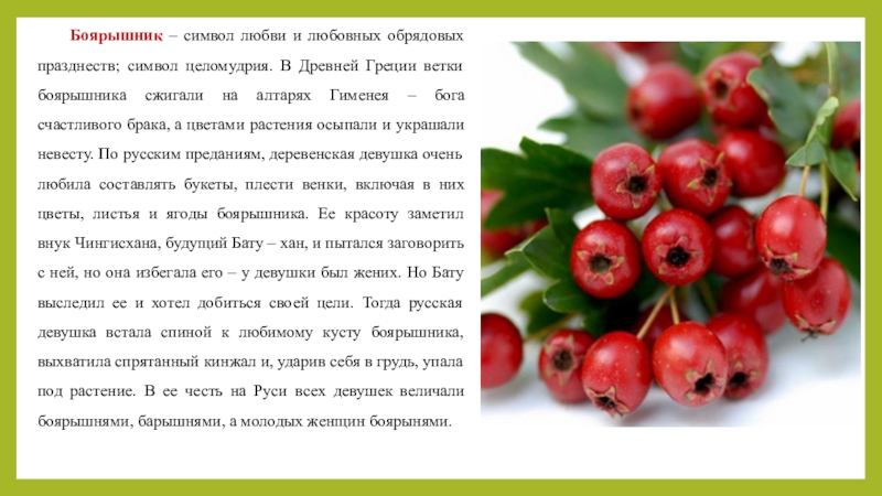 Слайд 8Боярышник – символ любви и любовных обрядовых празднеств; символ целомудрия. В