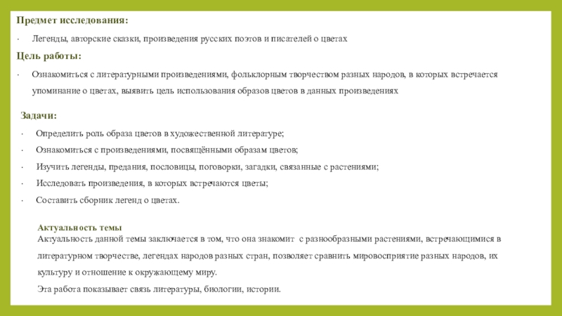 Ознакомиться с литературными произведениями, фольклорным творчеством разных народов, в которых встречается упоминание о цветах, выявить цель использования образов цветов в данных произведениях