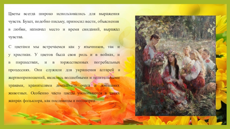 Слайд 4Цветы всегда широко использовались для выражения чувств. Букет, подобно письму, приносил