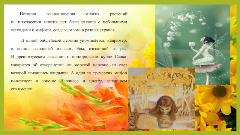 В одной библейской легенде упоминается, например, о лилии, выросшей из слез Евы, изгнанной из рая. В древнерусском сказании о новгородском купце Садко говорится об отвергнутой им морской царевне, из слез которой появились ландыши. А один из греческих мифов повествует о юноше Нарциссе и цветке, названном его именем.