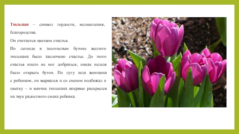 Слайд 13Тюльпан – символ гордости, великолепия, благородства.