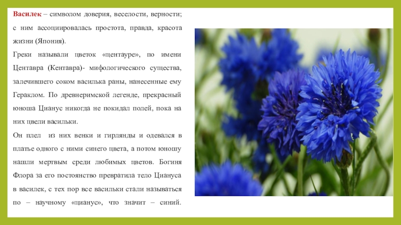 Слайд 9Василек – символом доверия, веселости, верности; с ним ассоциировалась простота, правда, красота
