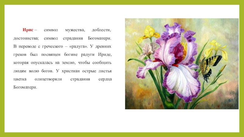 Слайд 14Ирис – символ мужества, доблести, достоинства; символ страдания Богоматери.