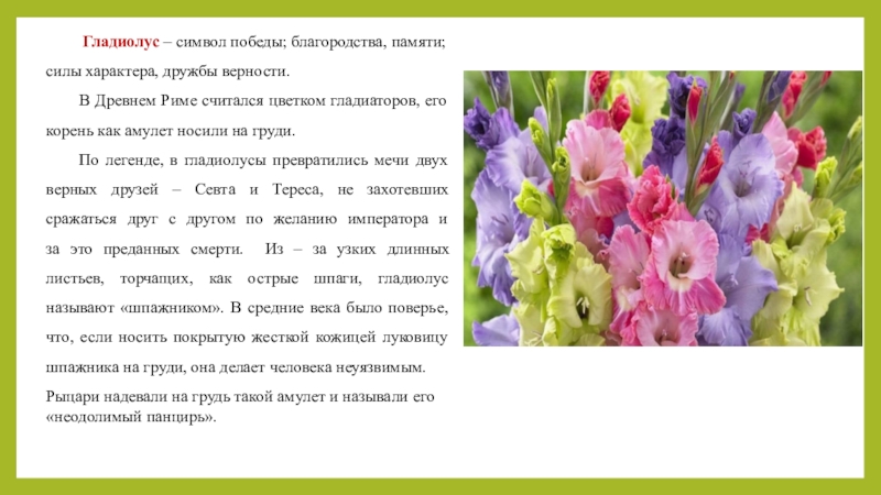 Слайд 12 Гладиолус – символ победы; благородства, памяти; силы характера, дружбы верности.