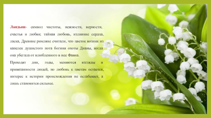 Слайд 16Ландыш- символ чистоты, нежности, верности, счастья и любви; тайная любовь, излияние