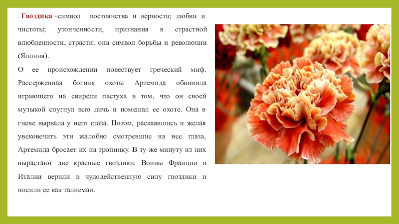 Слайд 11 Гвоздика –символ постоянства и верности; любви и чистоты; утонченности, признания в