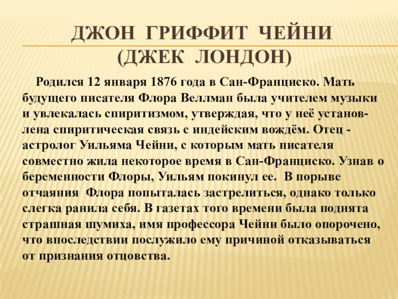 1876 года в Сан-Франциско. Мать будущего писателя Флора Веллман была учителем музыки и увлекалась спиритизмом, утверждая, что у неё установ-лена спиритическая связь с индейским вождём. Отец - астролог Уильяма Чейни, с которым мать писателя совместно жила некоторое время в Сан-Франциско. Узнав о беременности Флоры, Уильям покинул ее. В порыве отчаяния Флора попыталась застрелиться, однако только слегка ранила себя. В газетах того времени была поднята страшная шумиха, имя профессора Чейни было опорочено, что впоследствии послужило ему причиной отказываться от признания отцовства.