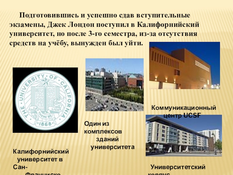 Слайд 10 Подготовившись и успешно сдав вступительные экзамены, Джек Лондон