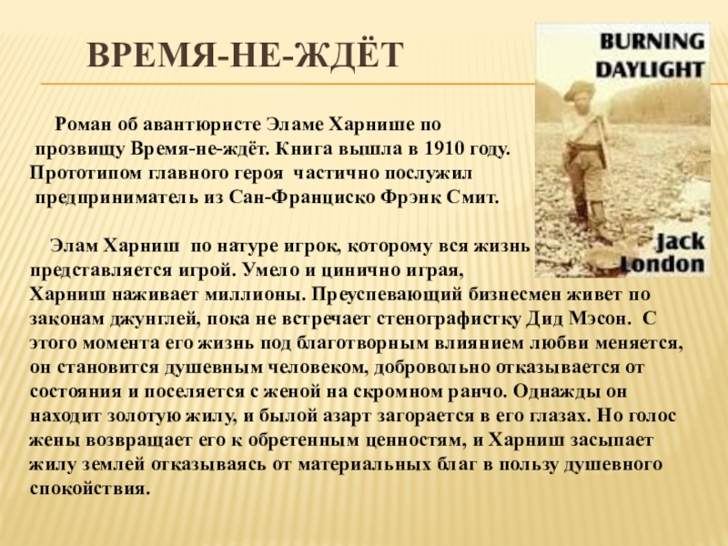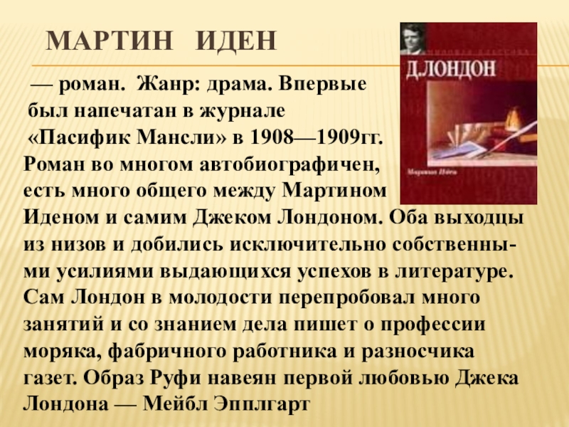 Иденом и самим Джеком Лондоном. Оба выходцы из низов и добились исключительно собственны-ми усилиями выдающихся успехов в литературе. Сам Лондон в молодости перепробовал много занятий и со знанием дела пишет о профессии моряка, фабричного работника и разносчика газет. Образ Руфи навеян первой любовью Джека Лондона — Мейбл Эпплгарт