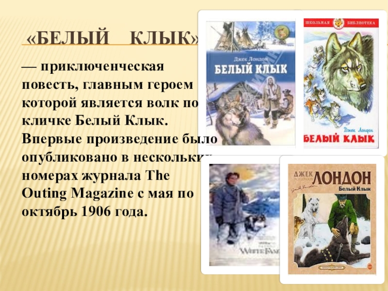 по кличке Белый Клык. Впервые произведение было опубликовано в нескольких номерах журнала The Outing Magazine с мая по октябрь 1906 года.