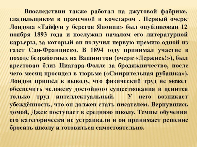 прачечной и кочегаром . Первый очерк Лондона «Тайфун у берегов Японии» был опубликован 12 ноября 1893 года и послужил началом его литературной карьеры, за который он получил первую премию одной из газет Сан-Франциско. В 1894 году принимал участие в походе безработных на Вашингтон (очерк «Держись!»), был арестован близ Ниагара-Фоллс за бродяжничество, после чего месяц просидел в тюрьме («Смирительная рубашка»). Лондон пришёл к выводу, что физический труд не может обеспечить человеку достойного существования и ценится только труд интеллектуальный. У него возникает убеждённость, что он должен стать писателем. Вернувшись домой, Джек поступает в среднюю школу. Темпы обучения его категорически не устраивали и он принимает решение бросить школу и готовиться самостоятельно.