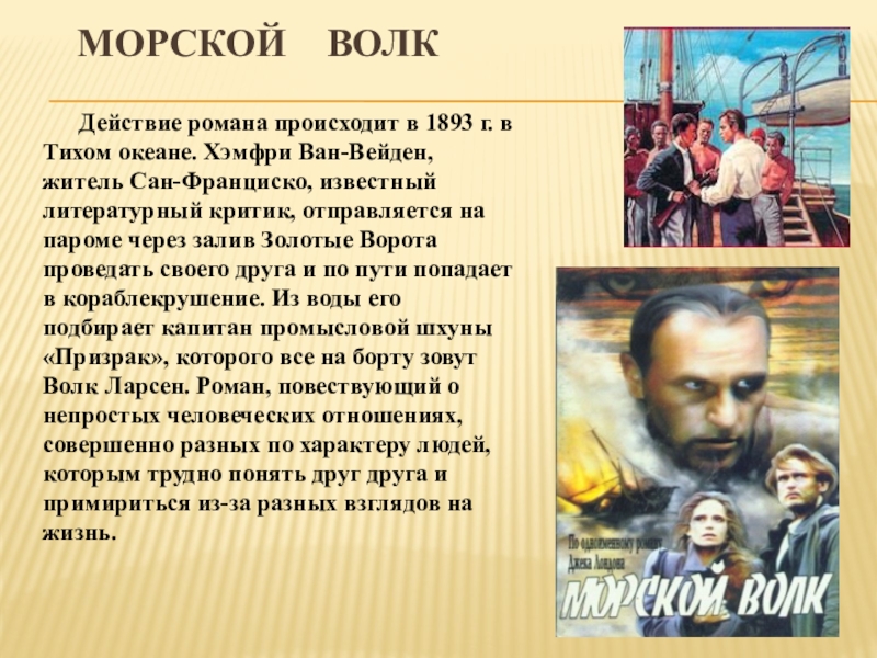 1893 г. в Тихом океане. Хэмфри Ван-Вейден, житель Сан-Франциско, известный литературный критик, отправляется на пароме через залив Золотые Ворота проведать своего друга и по пути попадает в кораблекрушение. Из воды его подбирает капитан промысловой шхуны «Призрак», которого все на борту зовут Волк Ларсен. Роман, повествующий о непростых человеческих отношениях, совершенно разных по характеру людей, которым трудно понять друг друга и примириться из-за разных взглядов на жизнь.