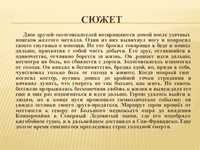 поисков желтого металла. Один из них вывихнул ногу и попросил своего спутника о помощи. Но тот бросил товарища в беде и пошел дальше, прихватив с собой часть добычи. Его друг, оставшийся в одиночестве, отчаянно борется за жизнь. Он .решает идти дальше, несмотря на боль, но сбивается с дороги. Золотоискатель изнемогал от голода. Он впадал в беспамятство, бредил едой, но, придя в себя, чувствовал только боль от голода в животе. Когда мокрый снег погасил костер, путник дошел до крайней точки страдания и начинал думать, что умереть не так больно, как жить. Но сквозь бессилие прорывалась бесконечная любовь к жизни и вынуждала его еще и еще раз подниматься и идти дальше. Герою удалось выйти к людям, но в конце пути произошло символическое событие: он увидел останки своего друга-предателя. Маршрут героя прошёл от местности к северу от Большого медвежьего озера до впадения Коппермайна в Северный Ледовитый океан, где его подобрало китобойное судно, и в дальнейшем доставило в Сан-Франциско. Еще долгое время спасшегося преследовал страх голодной смерти.