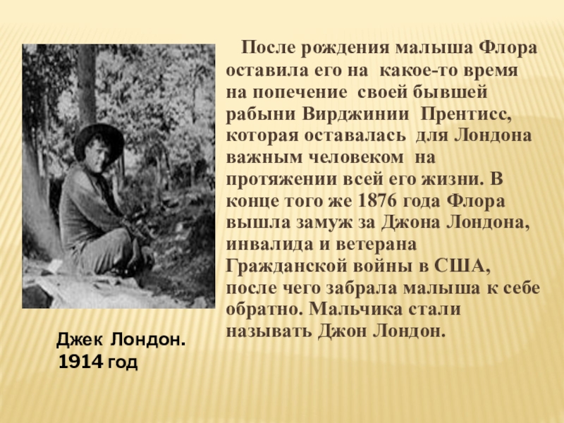 на попечение своей бывшей рабыни Вирджинии Прентисс, которая оставалась для Лондона важным человеком на протяжении всей его жизни. В конце того же 1876 года Флора вышла замуж за Джона Лондона, инвалида и ветерана Гражданской войны в США, после чего забрала малыша к себе обратно. Мальчика стали называть Джон Лондон.