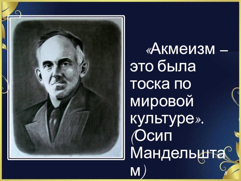 Слайд 8 «Акмеизм – это была тоска по мировой культуре». (Осип Мандельштам)