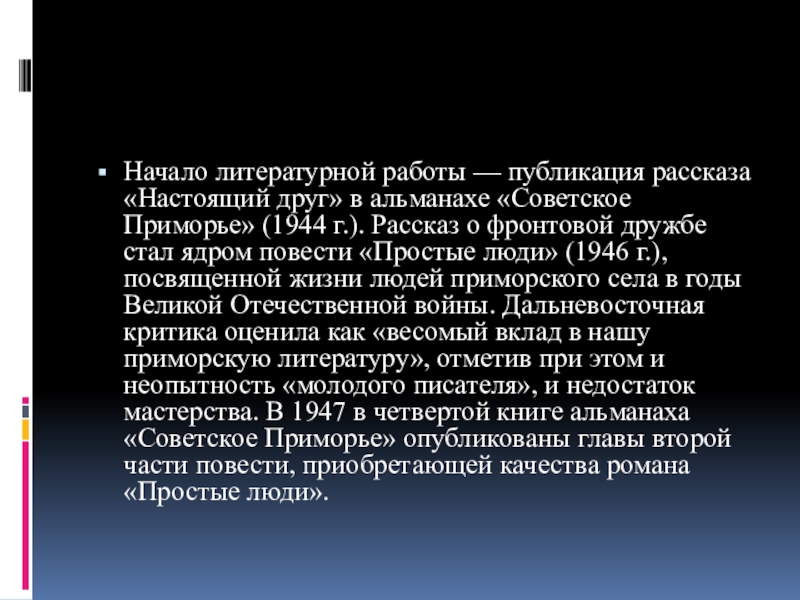 Приморье» (1944 г.). Рассказ о фронтовой дружбе стал ядром повести «Простые люди» (1946 г.), посвященной жизни людей приморского села в годы Великой Отечественной войны. Дальневосточная критика оценила как «весомый вклад в нашу приморскую литературу», отметив при этом и неопытность «молодого писателя», и недостаток мастерства. В 1947 в четвертой книге альманаха «Советское Приморье» опубликованы главы второй части повести, приобретающей качества романа «Простые люди».
