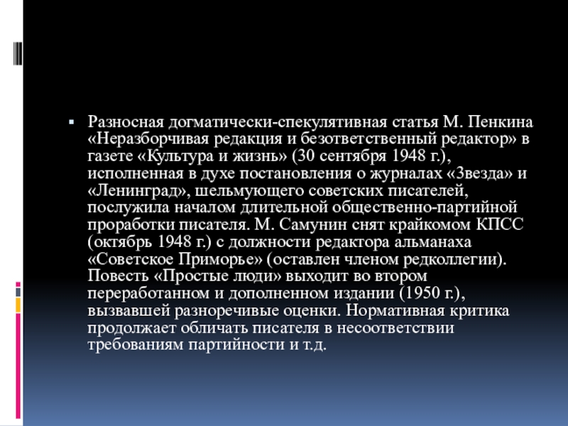 газете «Культура и жизнь» (30 сентября 1948 г.), исполненная в духе постановления о журналах «3везда» и «Ленинград», шельмующего советских писателей, послужила началом длительной общественно-партийной проработки писателя. М. Самунин снят крайкомом КПСС (октябрь 1948 г.) с должности редактора альманаха «Советское Приморье» (оставлен членом редколлегии). Повесть «Простые люди» выходит во втором переработанном и дополненном издании (1950 г.), вызвавшей разноречивые оценки. Нормативная критика продолжает обличать писателя в несоответствии требованиям партийности и т.д.