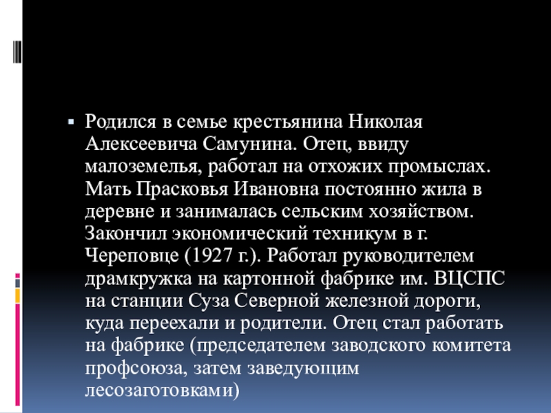 Слайд 7Родился в семье крестьянина Николая Алексеевича Самунина. Отец, ввиду малоземелья, работал