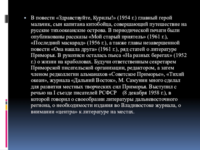 китобойца, совершающий путешествие на русские тихоокеанские острова. В периодической печати были опубликованы рассказы «Мой старый приятель» (1961 г.), «Последний маскарад» (1956 г.), а также главы незавершенной повести «Она нашла друга» (1961 г.), ряд статей о литературе Приморья. В рукописи осталась пьеса «На разных берегах» (1952 г.) о жизни на краболовах. Будучи ответственным секретарем Приморской писательской организации, редактором, а затем членом редколлегии альманахов «Советское Приморье», «Тихий океан», журнала «Дальний Восток», М. Самунин много сделал для развития местных творческих сил Приморья. Выступил с речью на I съезде писателей РСФСР (8 декабря 1958 г.), в которой говорил о своеобразии литературы дальневосточного региона, о необходимости издания во Владивостоке журнала, о внимании «центра» к литературе на местах.
