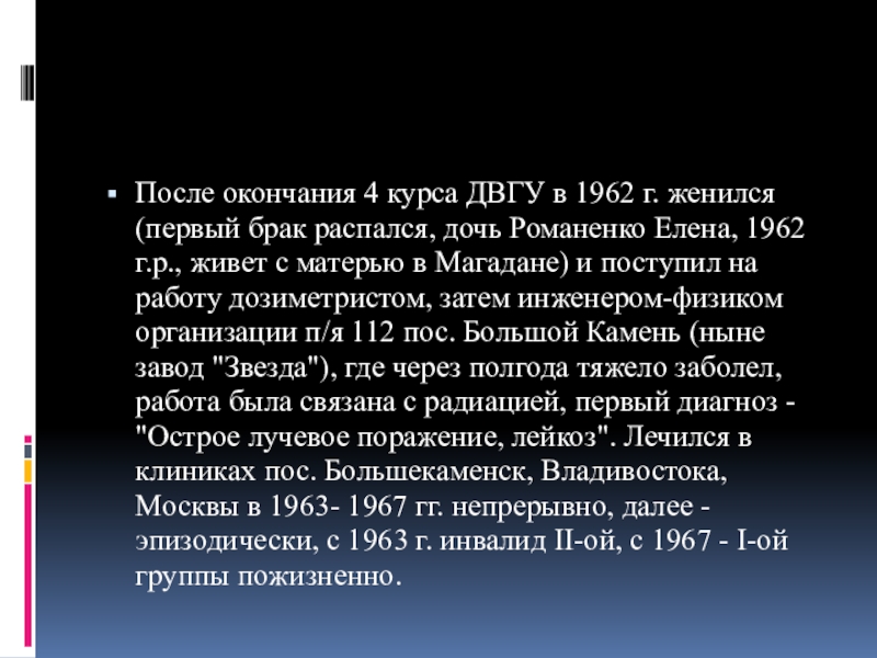 распался, дочь Романенко Елена, 1962 г.р., живет с матерью в Магадане) и поступил на работу дозиметристом, затем инженером-физиком организации п/я 112 пос. Большой Камень (ныне завод "Звезда"), где через полгода тяжело заболел, работа была связана с радиацией, первый диагноз - "Острое лучевое поражение, лейкоз". Лечился в клиниках пос. Большекаменск, Владивостока, Москвы в 1963- 1967 гг. непрерывно, далее - эпизодически, с 1963 г. инвалид II-ой, с 1967 - I-ой группы пожизненно.