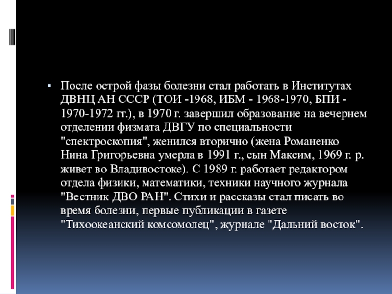Слайд 4После острой фазы болезни стал работать в Институтах ДВНЦ АН СССР