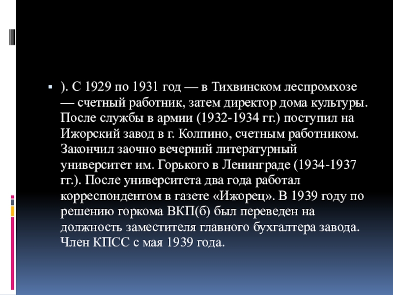 Слайд 8). С 1929 по 1931 год — в Тихвинском леспромхозе — счетный
