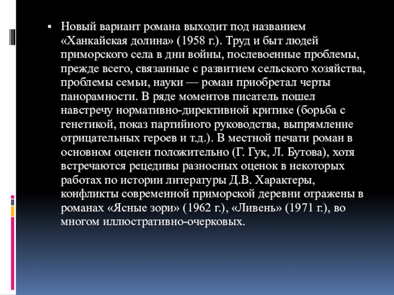 и быт людей приморского села в дни войны, послевоенные проблемы, прежде всего, связанные с развитием сельского хозяйства, проблемы семьи, науки — роман приобретал черты панорамности. В ряде моментов писатель пошел навстречу нормативно-директивной критике (борьба с генетикой, показ партийного руководства, выпрямление отрицательных героев и т.д.). В местной печати роман в основном оценен положительно (Г. Гук, Л. Бутова), хотя встречаются рецедивы разносных оценок в некоторых работах по истории литературы Д.В. Характеры, конфликты современной приморской деревни отражены в романах «Ясные зори» (1962 г.), «Ливень» (1971 г.), во многом иллюстративно-очерковых.
