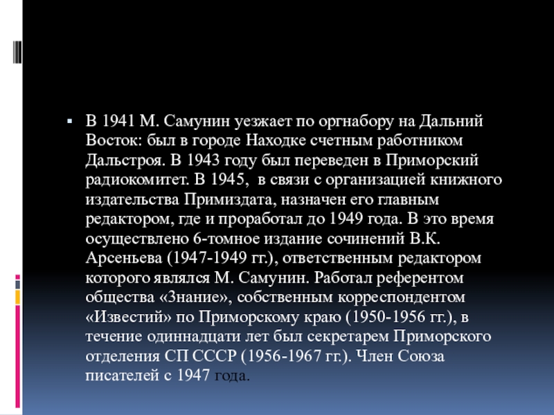Слайд 9В 1941 М. Самунин уезжает по оргнабору на Дальний Восток: был