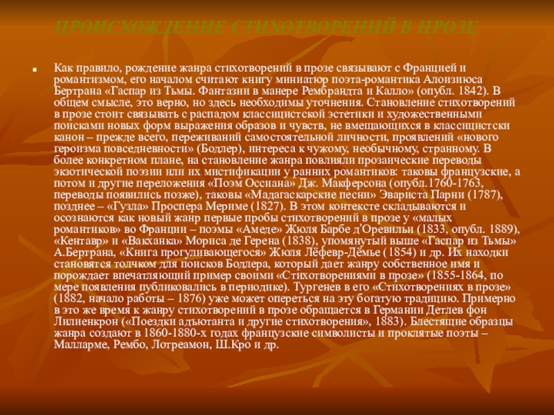 связывают с Францией и романтизмом, его началом считают книгу миниатюр поэта-романтика Алоизиюса Бертрана «Гаспар из Тьмы. Фантазии в манере Рембрандта и Калло» (опубл. 1842). В общем смысле, это верно, но здесь необходимы уточнения. Становление стихотворений в прозе стоит связывать с распадом классицистской эстетики и художественными поисками новых форм выражения образов и чувств, не вмещающихся в классицистски канон – прежде всего, переживаний самостоятельной личности, проявлений «нового героизма повседневности» (Бодлер), интереса к чужому, необычному, странному. В более конкретном плане, на становление жанра повлияли прозаические переводы экзотической поэзии или их мистификации у ранних романтиков: таковы французские, а потом и другие переложения «Поэм Оссиана» Дж. Макферсона (опубл.1760-1763, переводы появились позже), таковы «Мадагаскарские песни» Эвариста Парни (1787), позднее – «Гузла» Проспера Мериме (1827). В этом контексте складываются и осознаются как новый жанр первые пробы стихотворений в прозе у «малых романтиков» во Франции – поэмы «Амеде» Жюля Барбе д’Оревильи (1833, опубл. 1889), «Кентавр» и «Вакханка» Мориса де Герена (1838), упомянутый выше «Гаспар из Тьмы» А.Бертрана, «Книга прогуливающегося» Жюля Лёфевр-Дёмье (1854) и др. Их находки становятся толчком для поисков Бодлера, который дает жанру собственное имя и порождает впечатляющий пример своими «Стихотворениями в прозе» (1855-1864, по мере появления публиковались в периодике). Тургенев в его «Стихотворениях в прозе» (1882, начало работы – 1876) уже может опереться на эту богатую традицию. Примерно в это же время к жанру стихотворений в прозе обращается в Германии Детлев фон Лилиенкрон («Поездки адъютанта и другие стихотворения», 1883). Блестящие образцы жанра создают в 1860-1880-х годах французские символисты и проклятые поэты – Малларме, Рембо, Лотреамон, Ш.Кро и др.