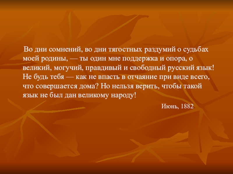 судьбах моей родины, — ты один мне поддержка и опора, о великий, могучий, правдивый и свободный русский язык! Не будь тебя — как не впасть в отчаяние при виде всего, что совершается дома? Но нельзя верить, чтобы такой язык не был дан великому народу!
