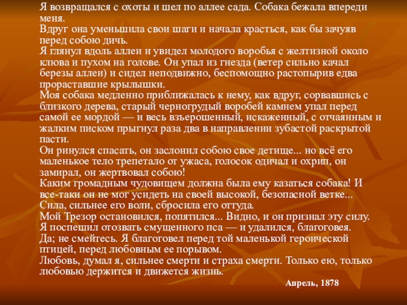 Моя собака медленно приближалась к нему, как вдруг, сорвавшись с близкого дерева, старый черногрудый воробей камнем упал перед самой ее мордой — и весь взъерошенный, искаженный, с отчаянным и жалким писком прыгнул раза два в направлении зубастой раскрытой пасти.