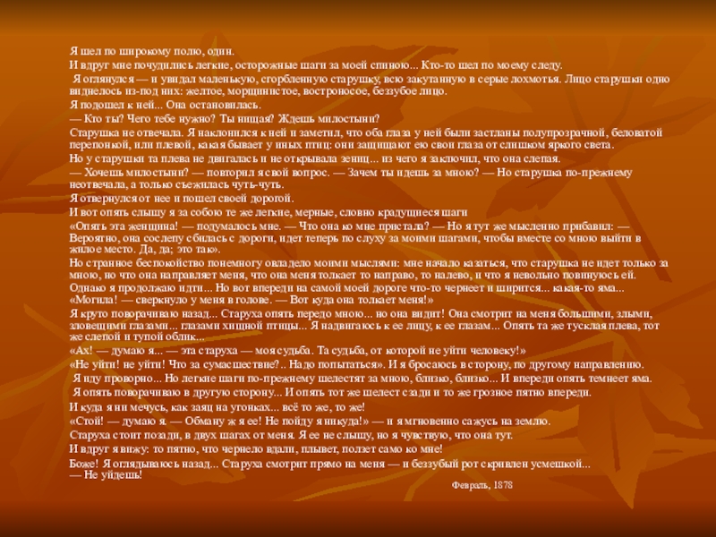 «Ах! — думаю я... — эта старуха — моя судьба. Та судьба, от которой не уйти человеку!»
