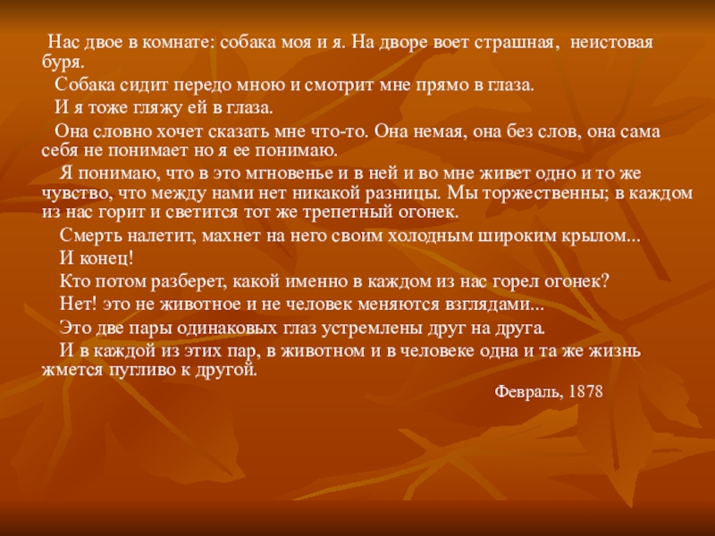 Нас двое в комнате: собака моя и я. На дворе воет страшная, неистовая буря.